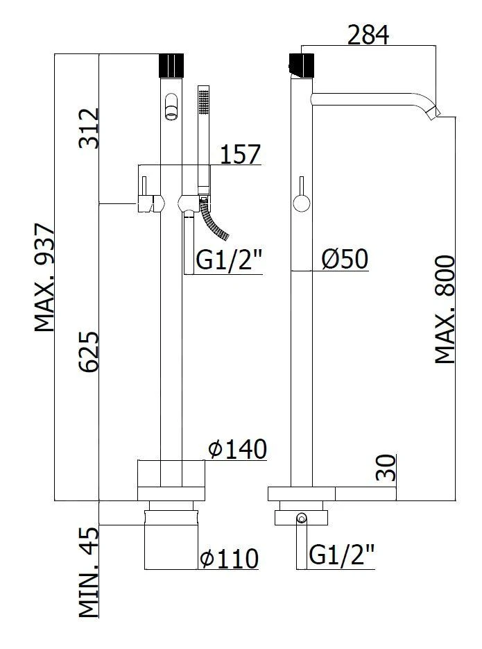 Vrijstaande eengreeps badkraan, met accessoires, zonder inbouwdeel