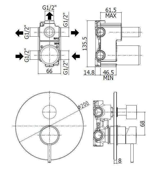 - G 1/2´´ aansluiting warm/koud en bovenuitgang