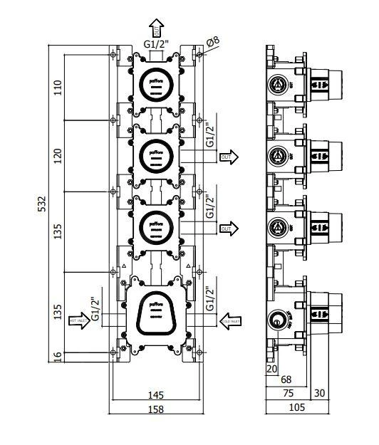- bij horizontale installatie moet de thermostaat rechts worden geplaatst