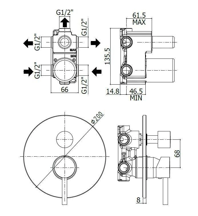 Eengreeps douchekraan met draaibare omstelling incl. inbouwdeel voor 3 uitgangen