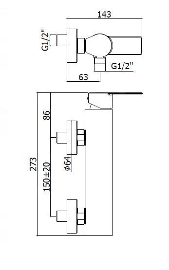 - afstand uitloop voor aansluiting doucheslang 63 mm (gemeten vanaf de muur tot het midden van de uitloop, zie technische tekening)